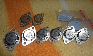 オリジナル2SD180さび2個生きていたやつ 代替用に手に入れた2N3055新品6個 (1個100円くらいだった) Hfeを測定し4個を選別し取替えた |