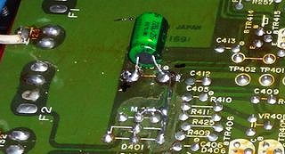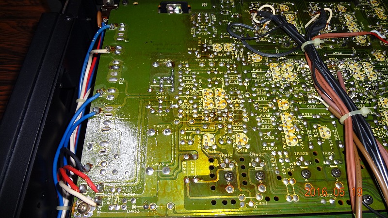 怪しいので裏蓋を開いて プリント基板を眺めると 銅はくが腐食しておりました 写真では良く見えませんが修復後です。 危機一髪でした、点検してみるもんですね |