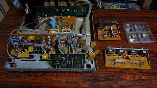 開腹しました ユニット化とコネクター接続でばらし易いです。 でも、部品点数が多いので手強そうです。 回路図がネットでもナカナカ見つからず・・・ のちに英語版のサービスMANUALが見つかりましたが・・・(一部分現物とは異なるが・・・) 参考にはなりました。 |