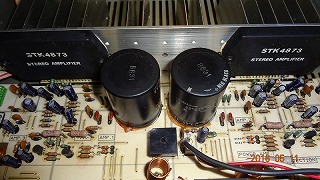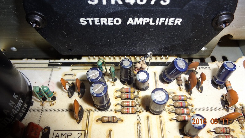 2ch/4chパワーアンプ STK4873、1個に2ch入りのICですね オクで手に入れたときはFRONT2chはOK REARは壊れている様子でした。オク説明あり まず、上蓋を開いて眺めます めんどくさいので、そのまま2ch動作品で良し として蓋をし1年間部品取りとしておきました。 |